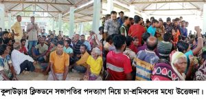 মৌলভীবাজারের কুলাউড়া উপজেলার জয়চন্ডী ইউনিয়নের ক্লিভডন চা-বাগান শ্রমিক পঞ্চায়েত কমিটির সভাপতির পদত্যাগ নিয়ে চা-শ্রমিকদের মধ্যে উত্তেজনা দেখা দিয়েছে। বৃহস্পতিবার (২৮ আগস্ট) সকাল থেকে শ্রমিকরা কাজে না গিয়ে বাগানের ম-পে সমবেত হয়ে সভাপতির পদত্যাগের দাবীতে বিক্ষোভ শুরু করেন। দুপুরে সভাপতি পক্ষের শ্রমিকরা এসে তাকে স্বপদে রাখার পক্ষে কথাবলা শুরু করেন। এনিয়ে দুই পক্ষের শ্রমিকরা উত্তেজিত হয়ে সংঘর্ষে জড়িয়ে পড়েন।