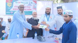 হাফিজ এনায়াতুল বারীর পবিত্র ক্বোরআন তেলাওয়াতের মাধ্যমে দ্বিতীয় পর্বে আলোচনা সভা, বিজয়ী প্রতিযোগিদের পুরস্কার বিতরণ ও দোয়া মাহফিল অনুষ্ঠিত হয়।