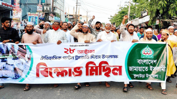 এইবেলা, কুলাউড়া :: ‘পল্টন হত্যা দিবস’ উপলক্ষে বাংলাদেশ জামায়াতে ইসলামীর কেন্দ্রীয় কর্মসূচির অংশ হিসেবে মৌলভীবাজারের কুলাউড়ায় উপজেলা জামায়াতের উদ্যোগে এক বিশাল বিক্ষোভ মিছিল ও পথসভা অনুষ্ঠিত হয়েছে। মঙ্গলবার (২৮ অক্টোবর)