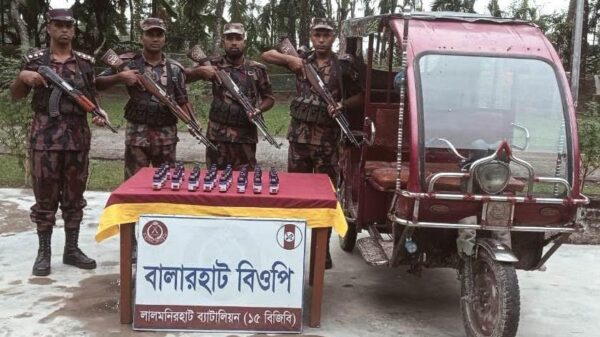 কুড়িগ্রাম প্রতিনিধি :: কুড়িগ্রামের ফুলবাড়ী উপজেলার বালাহাট সীমান্ত এলাকায় বিজিবি অভিযান চালিয়ে ভারতীয় ৪০ বোতল ইস্কাফ সিরাপ ও একটি ইজিবাইক জব্দ করেছে। এ অভিযানে মাদকদ্রব্য জব্দ করা হলেও দৌড়ে পালিয়ে