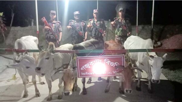 বড়লেখা প্রতিনিধি : বিজিবি-৫২ ব্যাটালিয়নের আওতাধীন বিয়ানীবাজারের দুবাগ মোড় নামক স্থান থেকে বিজিবি গজুকাটা বিওপির টহলদল শুক্রবার সন্ধ্যায় পাঁচটি অবৈধ ভারতীয় গরু আটক করেছে। এসময় পাচারকারিরা পালিয়ে যায়। জানা গেছে,